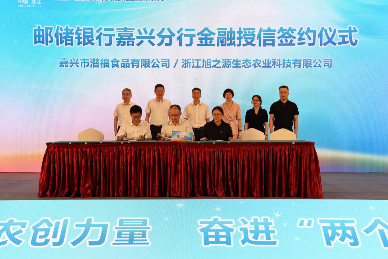 本次大赛是2022中国浙江“星耀南湖·长三角精英峰会”的重要赛事之一。大赛以“携手共富路,筑梦新乡村”为主题,紧扣“农业双强、乡村建设、农民共富”三大行动,以大赛为载体,搭建交流和融资平台,吸引优秀人才,营造乡村浓厚的“双创”氛围。在邮储银行嘉兴分行金融授信签约仪式上,经主办方推荐,嘉兴市分行与浙江旭之源生态农业科技有限公司、嘉兴市潜福食品有限公司签订了金融授信协议,授信金额共计1000万元。活动现场,嘉兴市分行还重点宣传了线上产品“红船极速贷”。